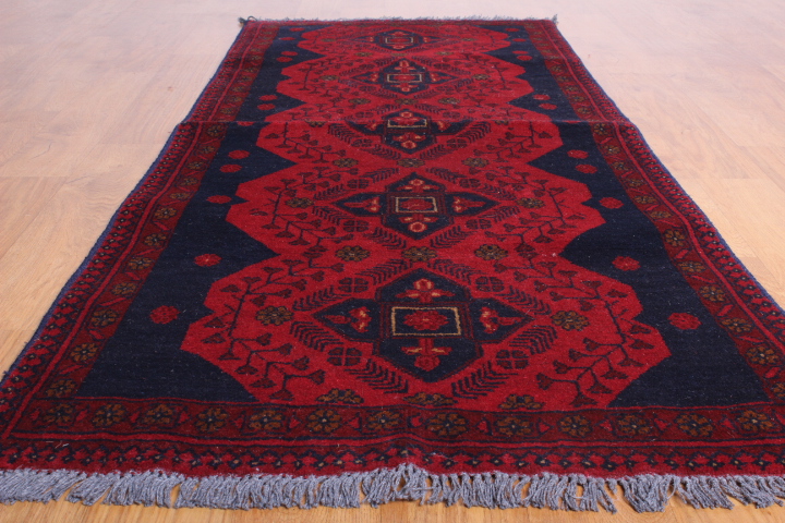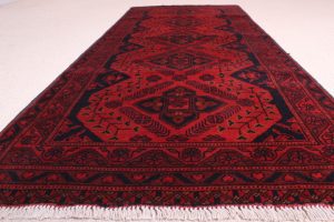 Andkhoy Bargaah: 200 x 74cm: Popularly known as Khal Mohammadi, the rug is one of the best examples available of its kind. The rug is a superb quality, super fine classic tribal rug from the Andkhoy region, home to the best quality tribal rugs coming out of today’s Afghanistan. The rich classic red colours, with shades of burnt orange, are unique to Andkhoy rugs. The dyes are 100% natural, mostly consisting of madder and indigo. The design is known as Bargaah.