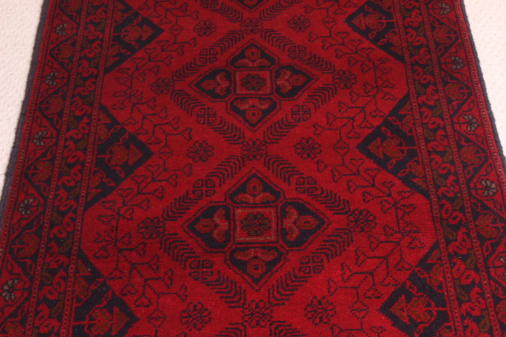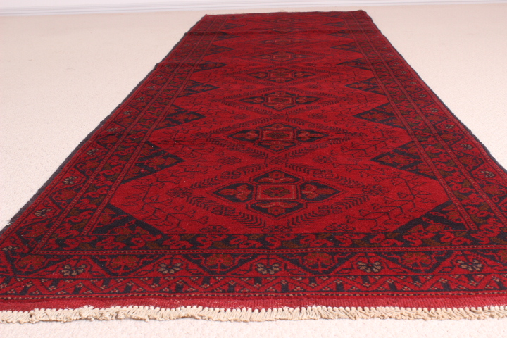 Andkhoy Bargaah: 300 x 80cm: Popularly known as Khal Mohammadi, the runner is one of the best examples available of its kind. It is a superb quality, super fine classic tribal rug from the Andkhoy region, home to the best quality tribal rugs coming out of today’s Afghanistan. The rich classic red colours, with shades of burnt orange, are unique to Andkhoy rugs. The dyes are 100% natural, mostly consisting of madder and indigo. The design is known as Bargaah.