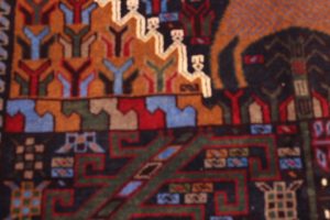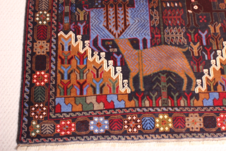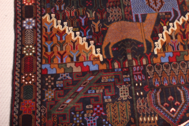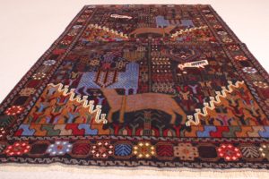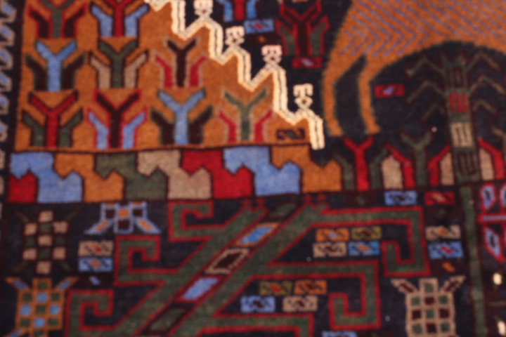 Afghan Nomadic Baluch: 200 x 115cm: An authentic, beautifully-woven, rich rug from the nomad tribes of Afghanistan. The rug was woven in the historic Herat region, bordering Iran, or ancient Persia. The design is “Aksee”, meaning pictorial.Â