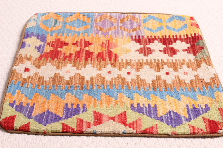 Chobi Cushion: 45 x 45cm: This extremely beautiful Chobi Kilim Tribal Cushion, with a zip at the back, is from the Turkoman tribes of Maimana region of Faryab, Afghanistan. It is woven from 100% wool with vegetable dyes.