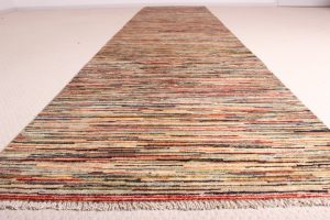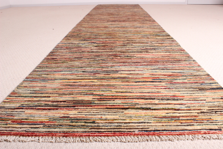 Gabbah: 400 X 81CM: An amazingly beautiful, Contemporary Village design Hand-Knotted rug from the Hazara tribes of Afghanistan. The rug is known for it’s superb quality workmanship, and is woven from 100% hand-spun wool, incorporating vegetable dyes.