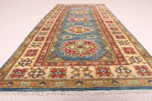 Ghazni: 190 x 66cm: A beautiful vegetable-dyed rug woven of hand-spun wool, also known as Afghan Kazak. A highly popular rug runner, Ghazni is best known for the “abrash” or marbled effect. The technique involves spinning the yarn so tight by hand so that the dyes do not permeate the yarn evenly, creating an uneven, but beautiful natural-looking, marbled effect.