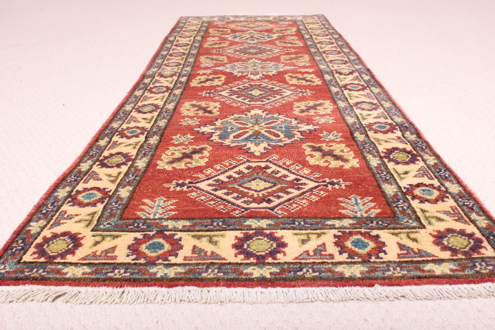 Ghazni: 190 x 63cm: A beautiful vegetable-dyed rug woven of hand-spun wool, also known as Afghan Kazak. A highly popular rug runner, Ghazni is best known for the “abrash” or marbled effect. The technique involves spinning the yarn so tight by hand so that the dyes do not permeate the yarn evenly, creating an uneven, but beautiful natural-looking, marbled effect.