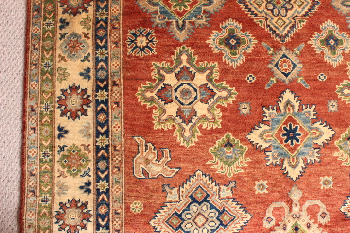 Ghazni: 245 x 170cm: A beautiful vegetable-dyed rug woven of hand-spun wool, also known as Afghan Kazak. A highly popular rug, Ghazni is best known for the “abrash” or marbled effect. The technique involves spinning the yarn so tight by hand so that the dyes do not permeate the yarn evenly, creating an uneven, but beautiful natural-looking, marbled effect.