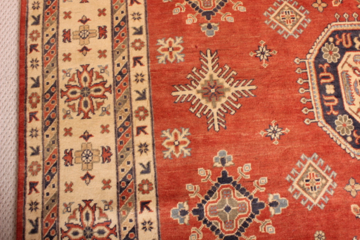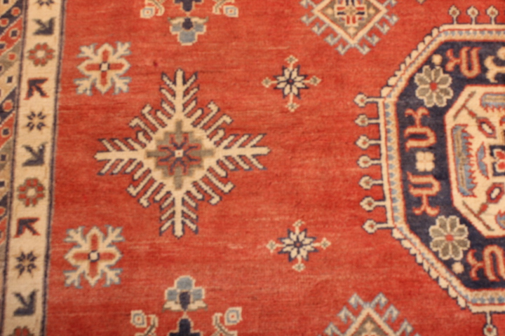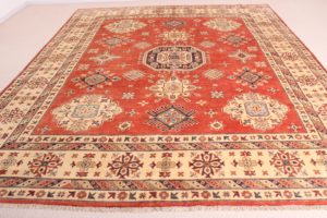 Ghazni: 300 X 240cm: A beautiful vegetable-dyed rug woven of hand-spun wool, also known as Afghan Kazak. A highly popular rug runner, Ghazni is best known for the “abrash” or marbled effect. The technique involves spinning the yarn so tight by hand so that the dyes do not permeate the yarn evenly, creating an uneven, but beautiful natural-looking, marbled effect.