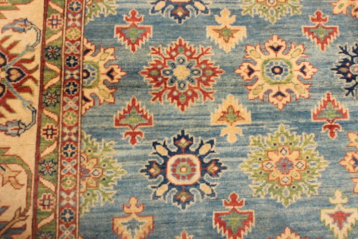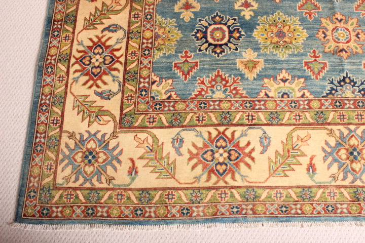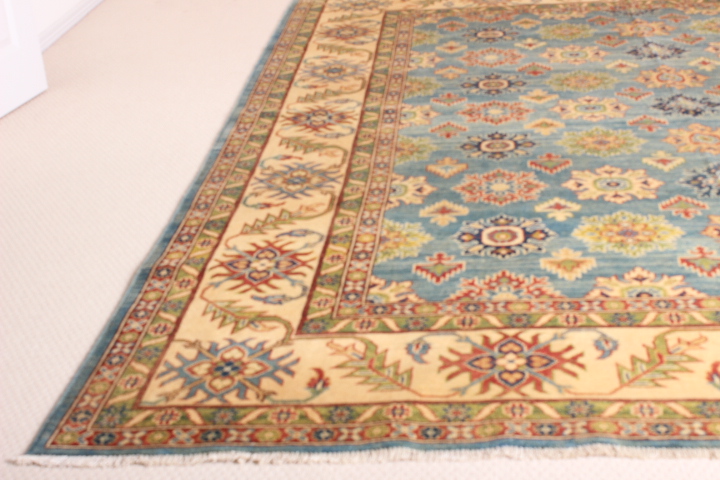 Ghazni: 300 X 250cm: A beautiful vegetable-dyed rug woven of hand-spun wool, also known as Afghan Kazak. A highly popular rug, Ghazni is best known for the “abrash” or marbled effect. The technique involves spinning the yarn so tight by hand so that the dyes do not permeate the yarn evenly, creating an uneven, but beautiful natural-looking, marbled effect.