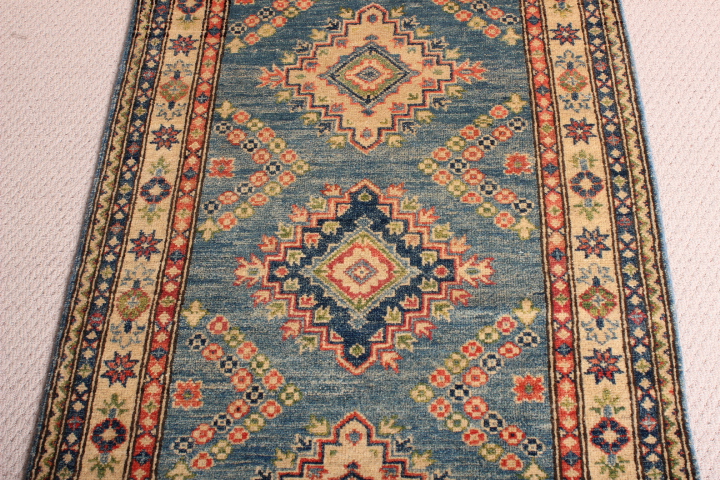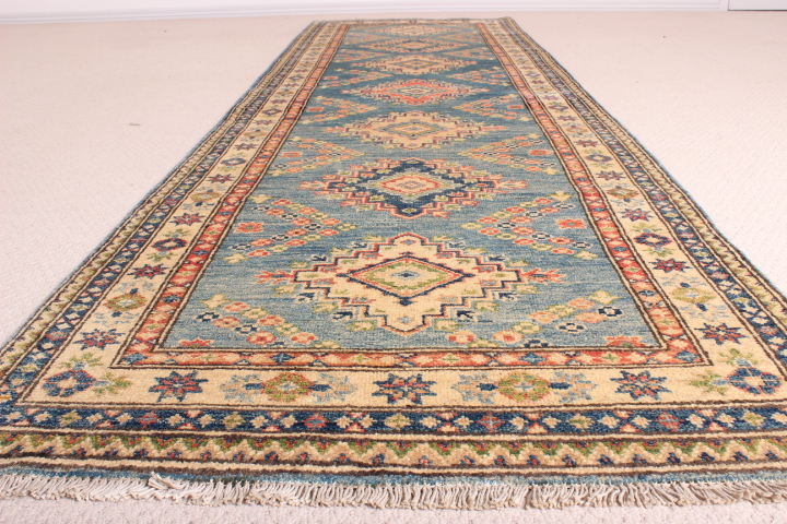 Ghazni: 300 X 86cm: A beautiful vegetable-dyed rug woven of hand-spun wool, also known as Afghan Kazak. A highly popular rug runner, Ghazni is best known for the “abrash” or marbled effect. The technique involves spinning the yarn so tight by hand so that the dyes do not permeate the yarn evenly, creating an uneven, but beautiful natural-looking, marbled effect.