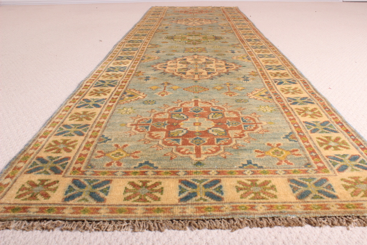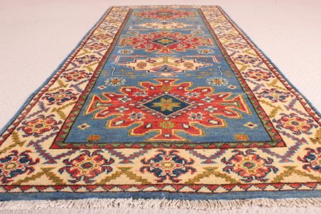 Ghazni: 300 x 78cm: A beautiful vegetable-dyed rug woven of hand-spun wool, also known as Afghan Kazak. A highly popular rug runner, Ghazni is best known for the “abrash” or marbled effect. The technique involves spinning the yarn so tight by hand so that the dyes do not permeate the yarn evenly, creating an uneven, but beautiful natural-looking, marbled effect.