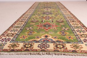 Ghazni: 300 X 85cm: A beautiful vegetable-dyed rug woven of hand-spun wool, also known as Afghan Kazak. A highly popular rug runner, Ghazni is best known for the “abrash” or marbled effect. The technique involves spinning the yarn so tight by hand so that the dyes do not permeate the yarn evenly, creating an uneven, but beautiful natural-looking, marbled effect.