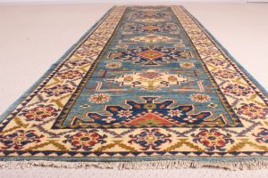 Ghazni: 300 X 82cm: A beautiful vegetable-dyed rug woven of hand-spun wool, also known as Afghan Kazak. A highly popular rug runner, Ghazni is best known for the “abrash” or marbled effect. The technique involves spinning the yarn so tight by hand so that the dyes do not permeate the yarn evenly, creating an uneven, but beautiful natural-looking, marbled effect.