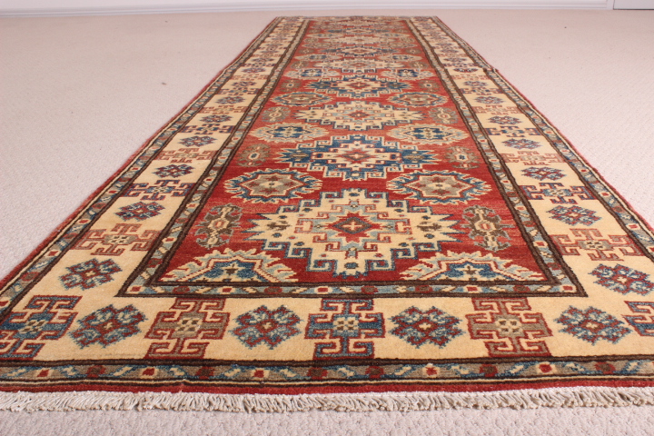 Ghazni: 300 X 82cm: A beautiful vegetable-dyed rug woven of hand-spun wool, also known as Afghan Kazak. A highly popular rug runner, Ghazni is best known for the “abrash” or marbled effect. The technique involves spinning the yarn so tight by hand so that the dyes do not permeate the yarn evenly, creating an uneven, but beautiful natural-looking, marbled effect.