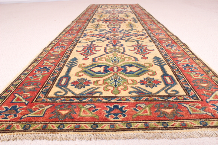 Ghazni: 300 x 84cm: A beautiful vegetable-dyed rug woven of hand-spun wool, also known as Afghan Kazak. A highly popular rug runner, Ghazni is best known for the “abrash” or marbled effect. The technique involves spinning the yarn so tight by hand so that the dyes do not permeate the yarn evenly, creating an uneven, but beautiful natural-looking, marbled effect.