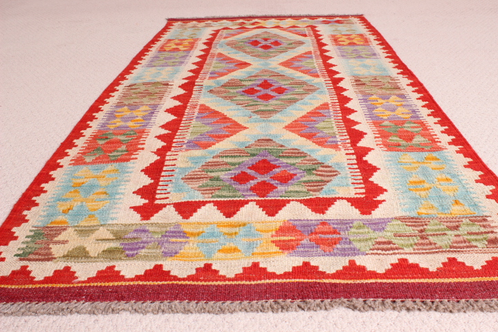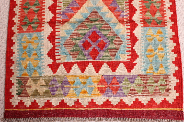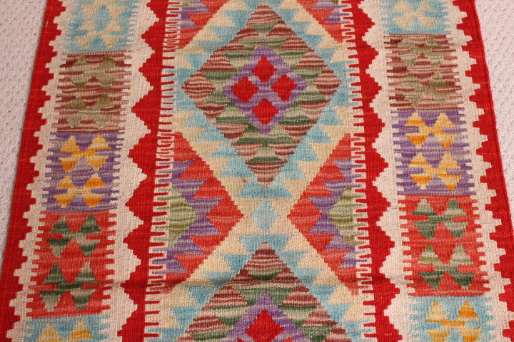 Kilim:Â 165 x 75cm:Â This is an extremely beautiful, intricately-woven, hand-woven Kilim from the Turkoman tribes of Maimana region of Faryab, Afghanistan. Representing a timeless design from the ancient Caucus, the Kilim is known as Chobi, short for Chobrang, or Choubi Kilim.