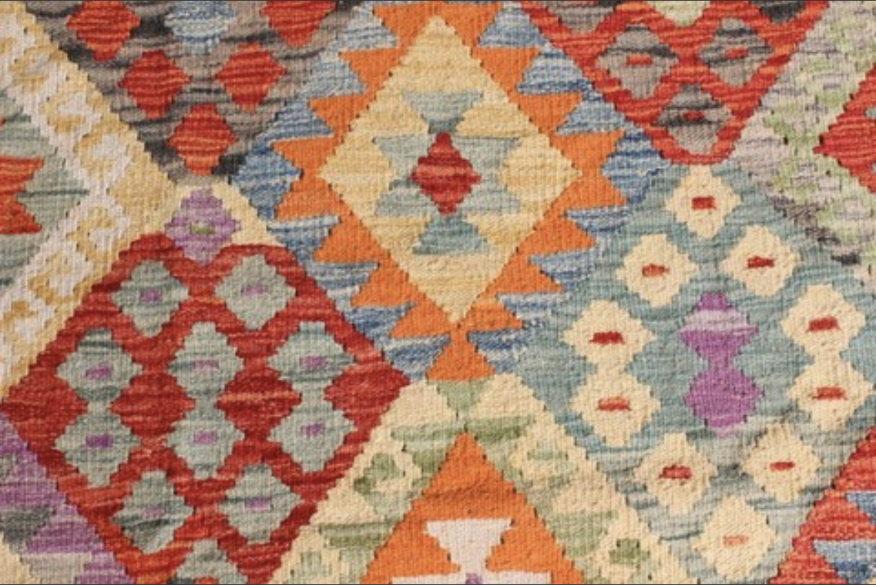Kilim: 400 X 300cm:Â This is an extremely beautiful, intricately-woven, hand-woven Kilim from the Turkoman tribes of Maimana region of Faryab, Afghanistan. Representing a timeless design from the ancient Caucus, the Kilim is known as Chobi, short for Chobrang, or Choubi Kilim.