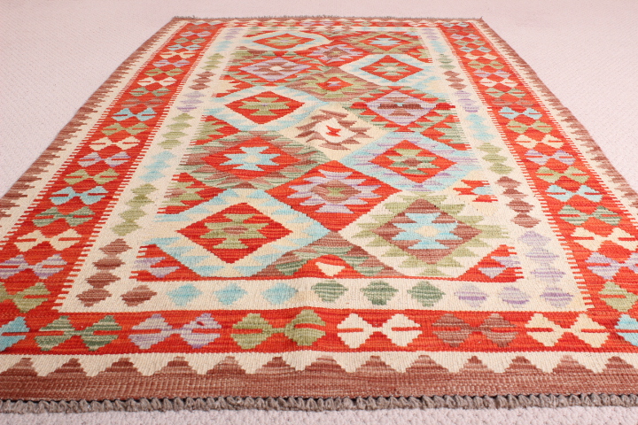 Kilim: 205 x 112cm: This is an extremely beautiful, intricately-woven, hand-woven Kilim from the Turkoman tribes of Maimana region of Faryab, Afghanistan. Representing a timeless design from the ancient Caucus, the Kilim is known as Chobi, short for Chobrang, or Choubi Kilim.
