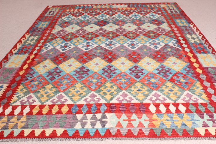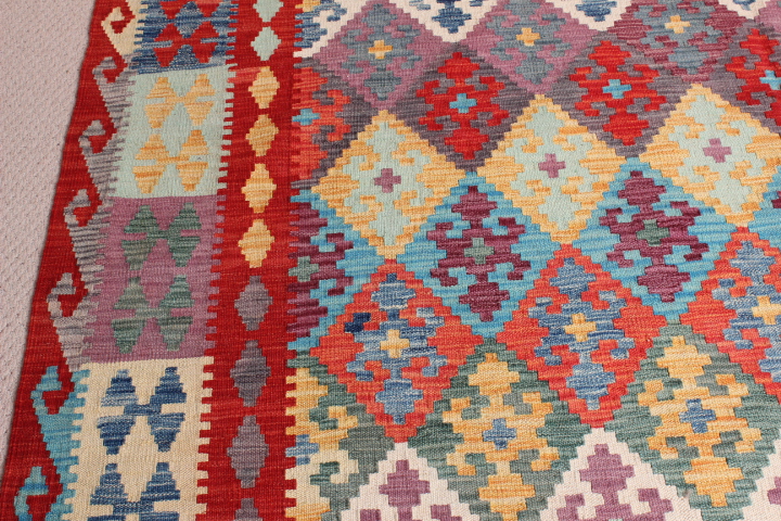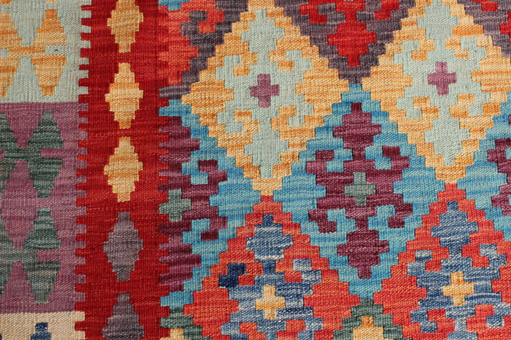 Kilim: 290 x 210cm: This is an extremely beautiful, intricately-woven, hand-woven Kilim from the Turkoman tribes of Maimana region of Faryab, Afghanistan. Representing a timeless design from the ancient Caucus, the Kilim is known as Chobi, short for Chobrang, or Choubi Kilim.