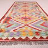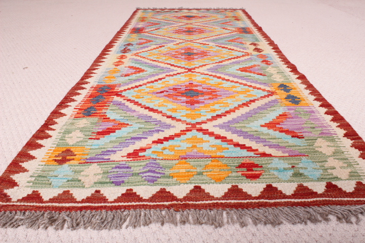 Kilim: 205 x 70cm: This is an extremely beautiful, intricately-woven, hand-woven Kilim from the Turkoman tribes of Maimana region of Faryab, Afghanistan. Representing a timeless design from the ancient Caucus, the Kilim is known as Chobi, short for Chobrang, or Choubi Kilim.