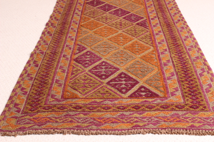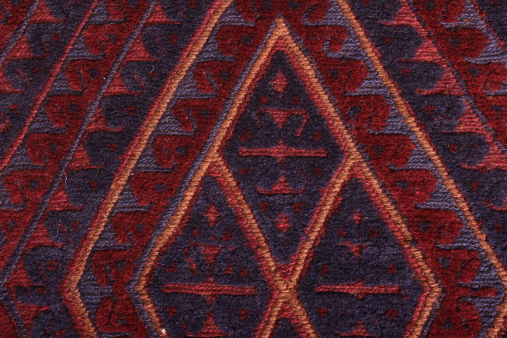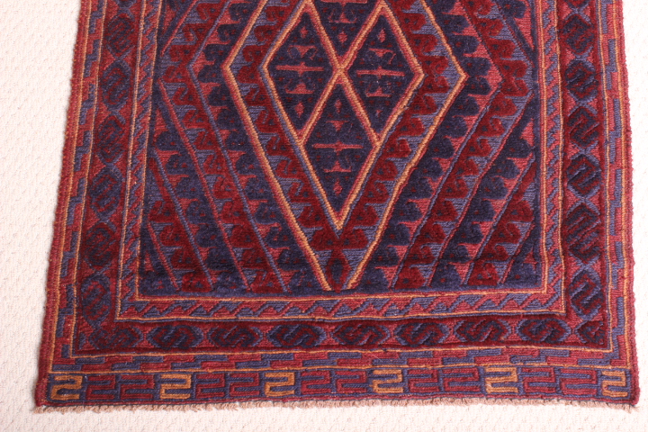 The rug is a combination of pile and flat weave from the Moshwani Baluch nomad tribes of historic Herat in Afghanistan. It’s known for the uniqueness of its design, and is woven from 100% wool, incorporating natural dyes. Herat was a key art and poetry centre of the old Persian civilization. Every Baluch rug is a unique piece and a work of art.