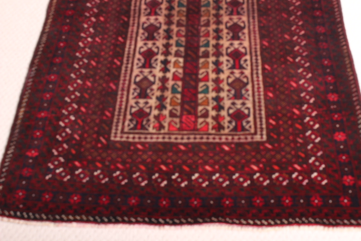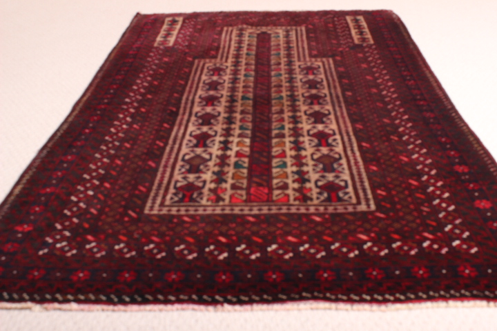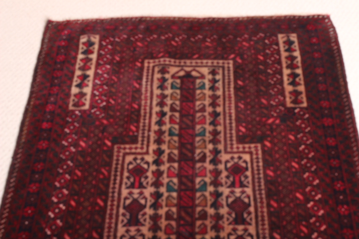 Jainamaz: Prayer Rug: 155 X 90CM: This beautiful, rich Hand-knotted Prayer Rug comes from the Baluch nomad tribes of historic Herat region of Afghanistan, bordering Iran, or Persia. Herat was a key art and poetry centre of the old Persian civilization.